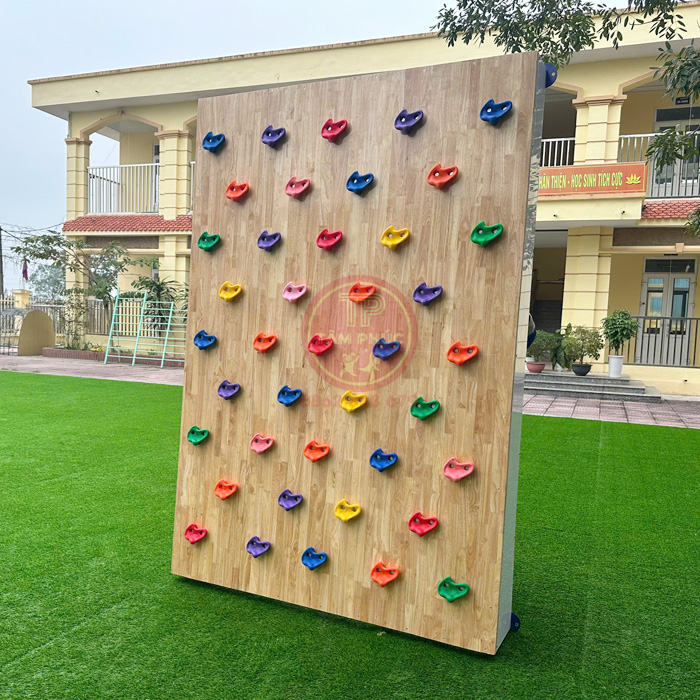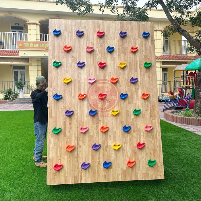 - Sản phẩm bộ vách leo núi bằng gỗ cho bé được lắp cố định. Thiết kế cho phép từ 3 – 5 bé cùng chơi 1 lúc. Là sản phẩm được các bé yêu thích vui chơi mỗi ngày.