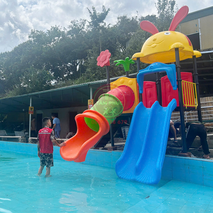 - Thiết kế đa năng 2 khối khá lớn gồm các module trò chơi như: Máng trượt đôi, máng trượt ống, cầu thang lên xuống bằng sắt, cùng các vách trang trí, trang trí đầu cộc hình lá cây, bông hoa, nổi bật với mái Thỏ ngộ nghĩnh đáng yêu. Mang tới cho các bé 1 trò chơi thú vị tại hồ bơi, bể bơi.