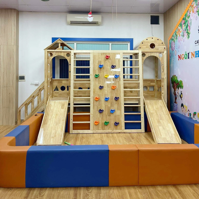 - Cầu trượt gỗ trong nhà vách leo núi cho bé được thiết kế dạng 2 khối tích hợp đa năng, được làm từ chất liệu gỗ tự nhiên được xử lý chống mối mọt, cong vênh, bền bỉ. Kết hợp các chất liệu khác như nhựa nhập khẩu,… Các chất liệu đảm bảo an toàn khi các bé tiếp xúc, vui chơi.