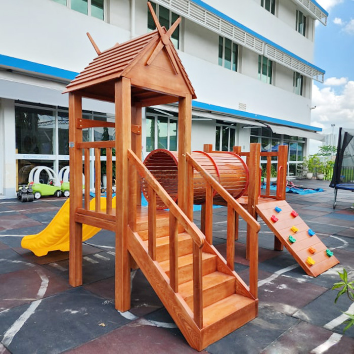 Không gian sử dụng cầu trượt liên hoàn gỗ ngoài trời cho bé: