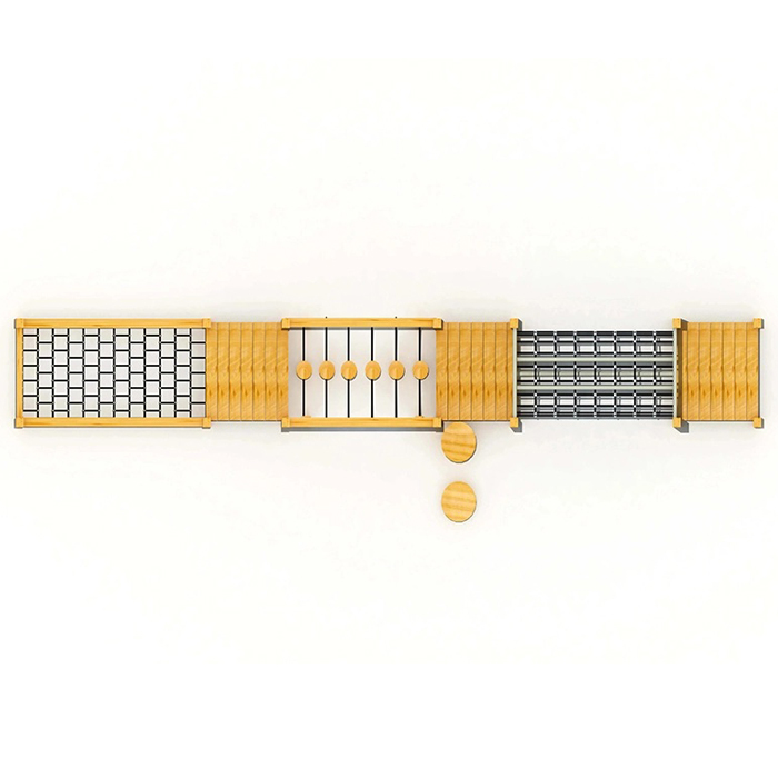 - Sản phẩm thiết kế đa năng tích hợp 1 tổ hợp liên hoàn các module trò chơi cho trẻ em, thiết kế khoa học, chắc chắn, và an toàn. Với các module trò chơi như: Ống chui lưới sắt; Cầu dao động gỗ; Vách lưới nằm, cùng các bục thăng bằng khác. Tạo nên một cụm trò chơi liên hoàn vận động thể chất cho trẻ vui chơi, trải nghiệm và vượt qua thử thách khi chơi.