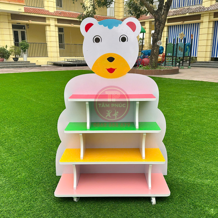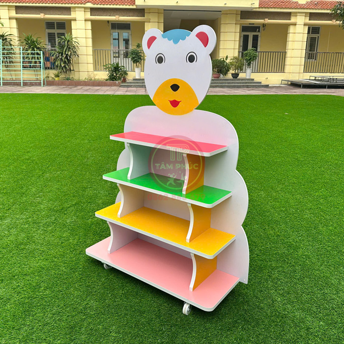 - Sản phẩm giá kệ bằng gỗ mdf 4 tầng con Gấu cho bé sử dụng phù hợp cho trường mầm non công lập, tư thục, khu vui chơi… để sách vở, truyện, tranh, đồ chơi,…