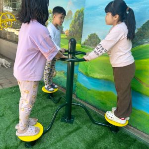 Sản phẩm được lắp đặt cố định tại sân trường mầm non, và cho phép 3 bé vui chơi tập luyện trên cùng 1 thiết bị.